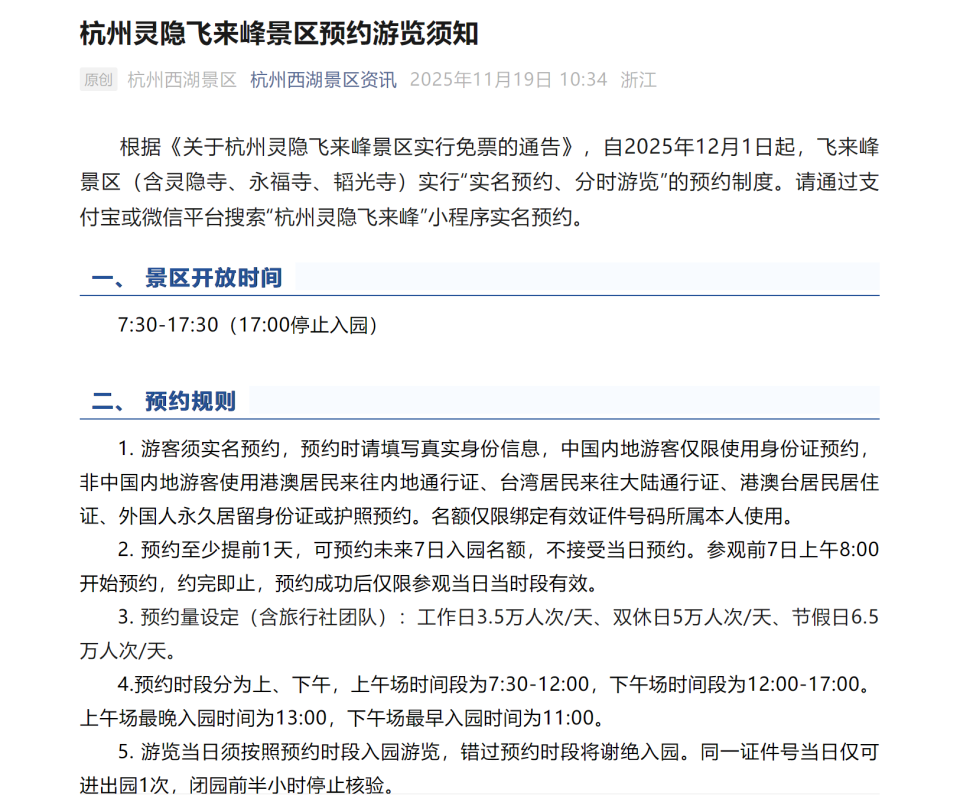 据“杭州灵隐”官方微信号:为满足广大市民游客需求,提升游览体验,经研究决定,灵隐飞来峰景区自2025年12月1日起实行免票。