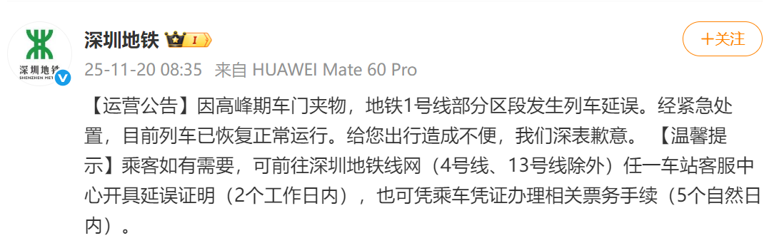 据@深圳地铁,因高峰期车门夹物,地铁1号线部分区段发生列车延误。经紧急处置,目前列车已恢复正常运行。给您出行造成不便,我们深表歉意。 【温馨提示】乘客如有需要,可前往深圳地铁线网(4号线、13号线除外)任一车站客服中心开具延误证明(2个工作日内),也可凭乘车凭证办理相关票务手续(5个自然日内)。